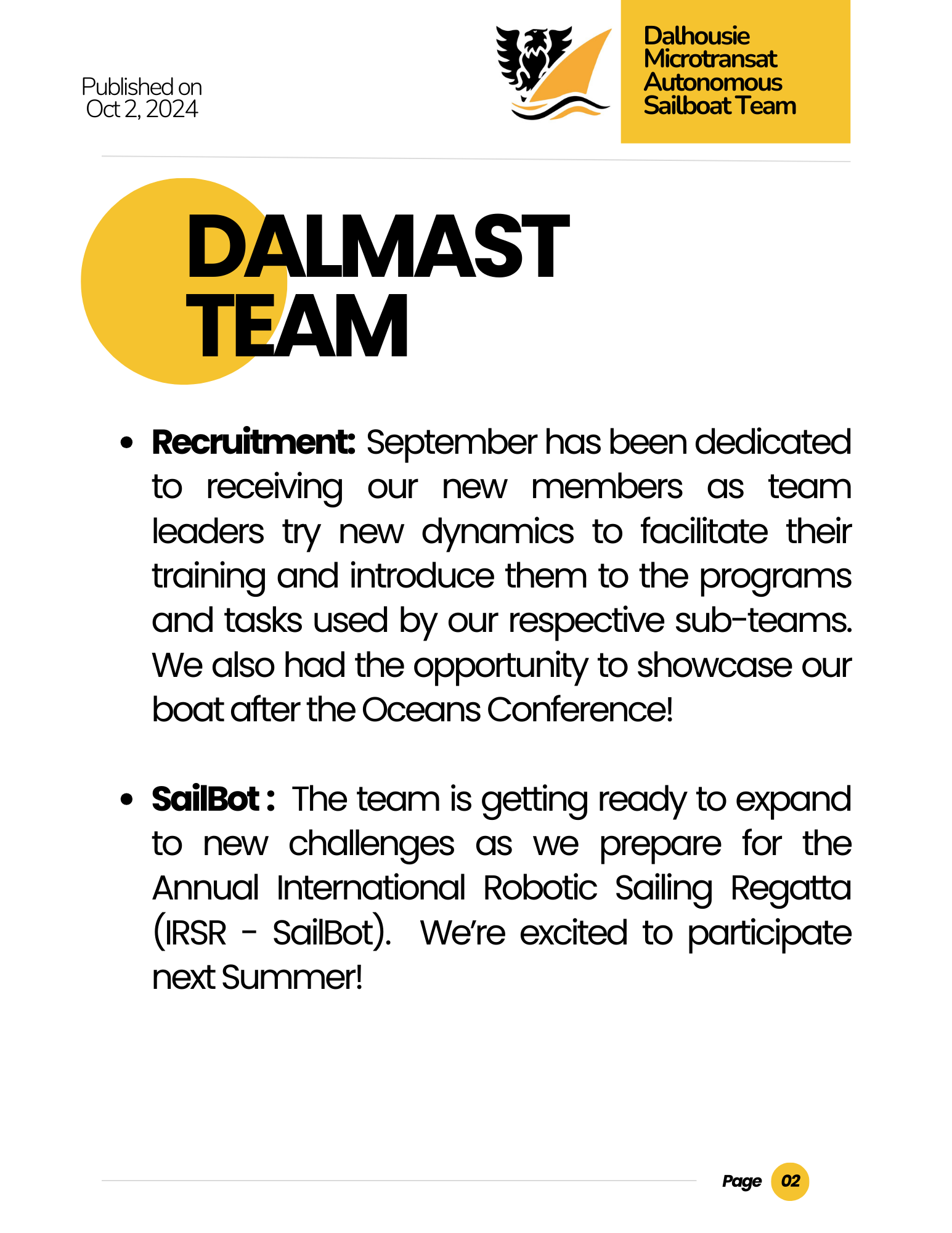 We are a team of Dalhousie students designing and building a sustainable, autonomous sailboat that will sail itself to Ireland as part of an international competition. Aside from our project, we try to promote the Ocean Engineering and Technology Industry by hosting events and competitions for students.